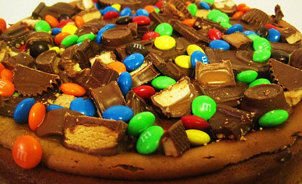Take cream cheese in a bowl. Add double cream and mix well. Chop chocolates and candies and sprinkle corn flour over them and mix well. Add them to cream cheese mixture.